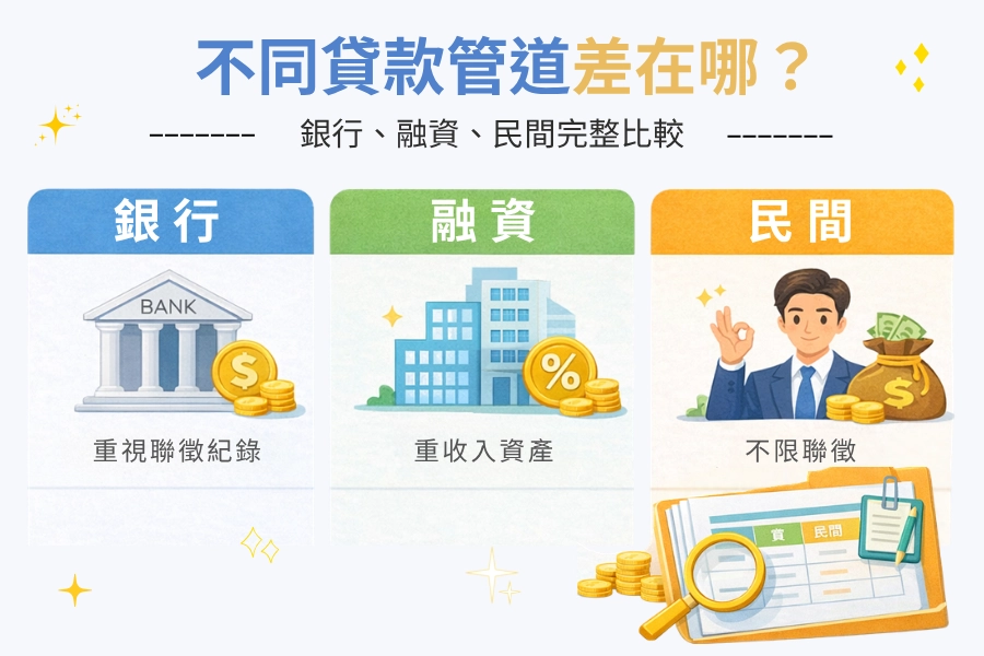 但不同貸款管道的標準差異很大,有些會特別看收入與資產,有些則重視擔保品,甚至有些不查聯徵紀錄。